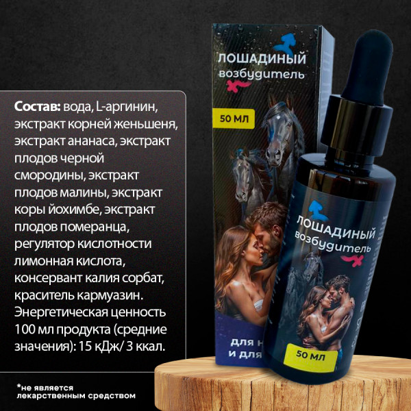 "Лошадиный возбудитель" - возбуждающие капли для двоих, которые воздействуют на организм мужчины и женщины, тонизируют и пробуждают чувственность, усиливают чувствительность во время полового акта. Компоненты препарата вызывают мощное возбуждение и усиливают влечение к противоположному полу. Помимо этого, средство позволяет получить больше удовольствия от секса!