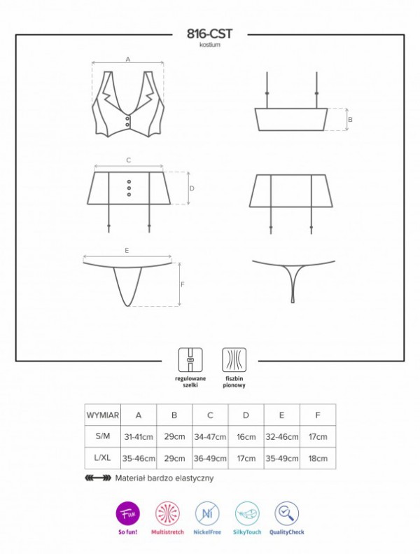 - Мини-юбочки, выполненной в одном стиле с топом, декорированной тремя пуговицами и прозрачными вставками по бокам. Регулируемые пажи для чулок позволяют подогнать изделие для любого роста. Пажи не съемные
